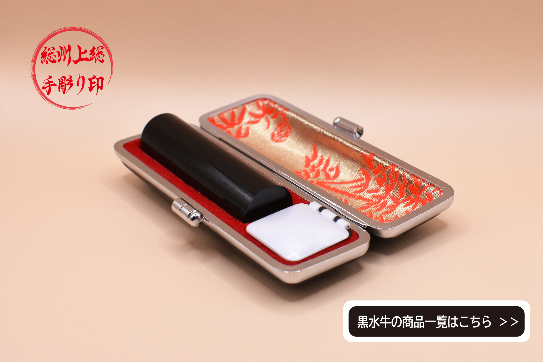 「黒水牛」は、耐久性も良く、価格も「柘植+α」といった感じで親しみやすい印材だと思います。(写真をタップしますと、黒水牛の商品一覧を表示いたします)