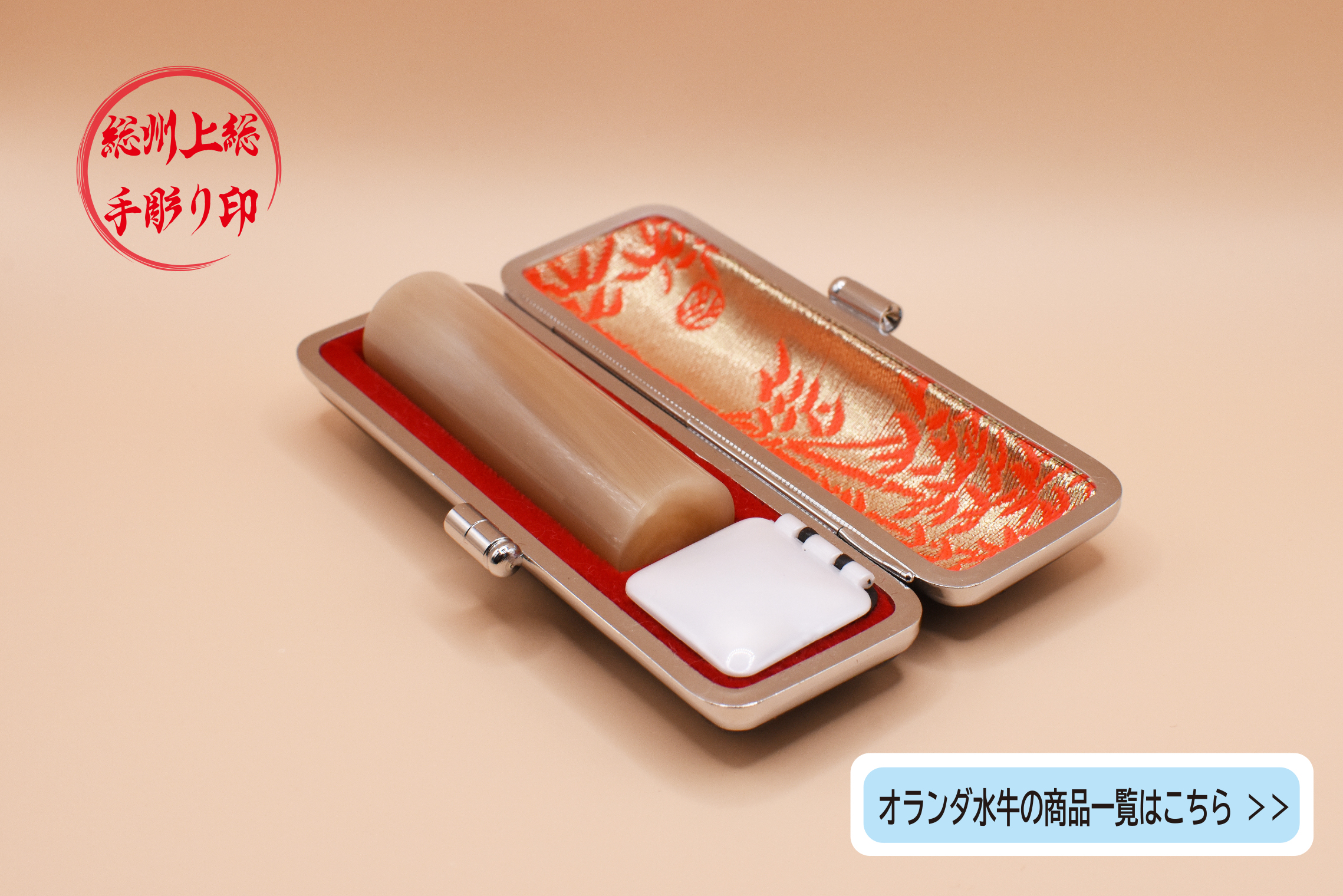手彫り印(手持ちの印刀で彫り上げる印鑑)でよく使われる印材には、「柘植(柘植の木の木目が温かい印材です)」、「黒水牛(水牛を黒く染色した印材です)」、「オランダ水牛(天然模様そのまま、美しい印材です)」、「本象牙(今も変わらず最高級の印材です)」「落款用石材印」がございます。