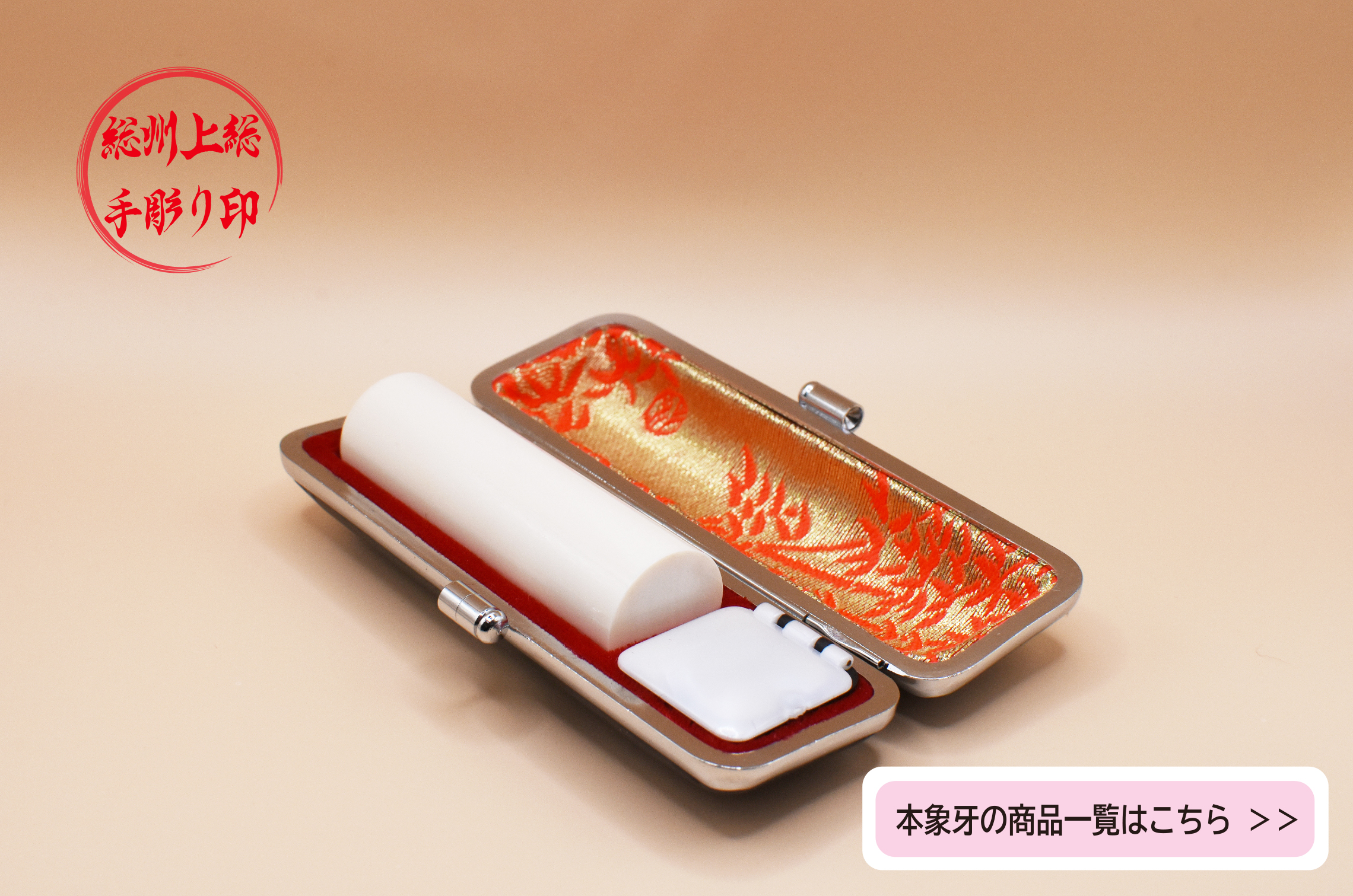 「本象牙」は、耐久性抜群の上に、外観に気品が感じられます。朱の付きに優れ、押印時の剛性感は素晴らしいと思います。また、製品には「政府認定の証」が添付されますので、正規品以外はお取り扱いできなくなっております。(写真をタップしますと、本象牙の商品一覧を表示いたします)